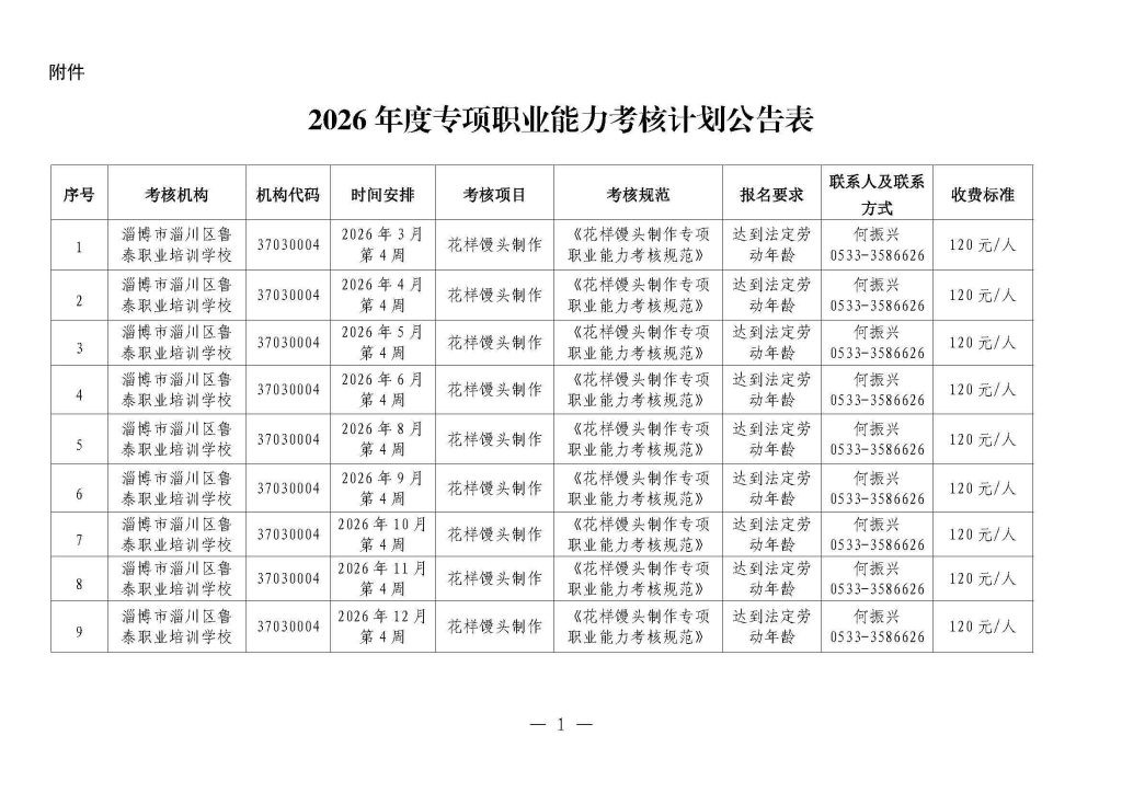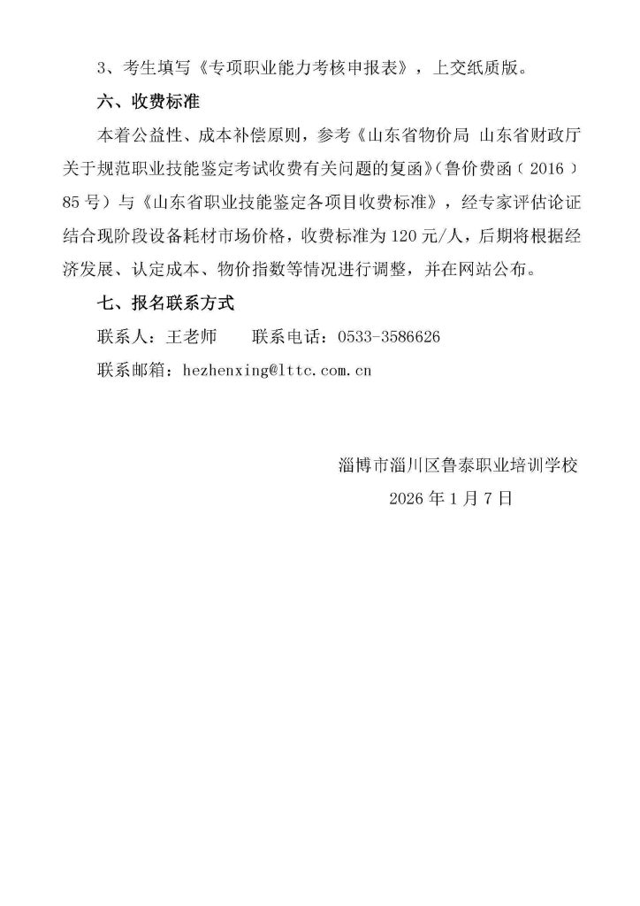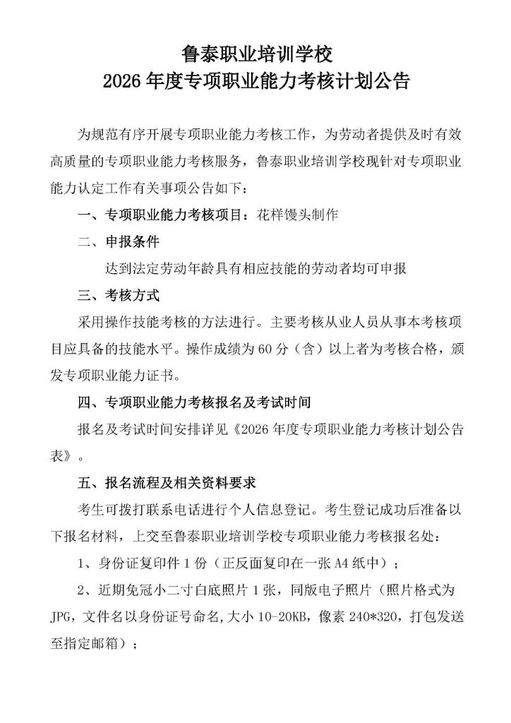 鲁泰职业培训学校2026年度专项职业能力考核计划公告